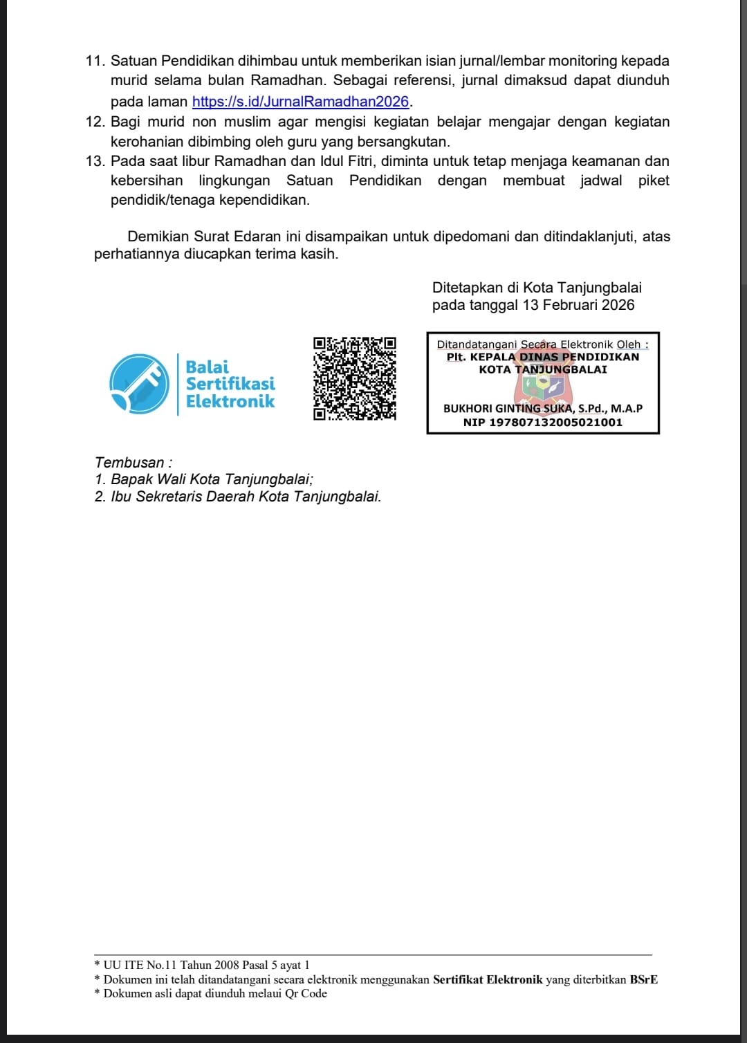 Surat Edaran tentang Pembelajaran di Bulan RamadhanOleh admin / 13 Februari 2026 SE DISDIK TANJUNGBALAI PEMBELAJARAN BULAN RAMADHAN 1447 H 2026 M